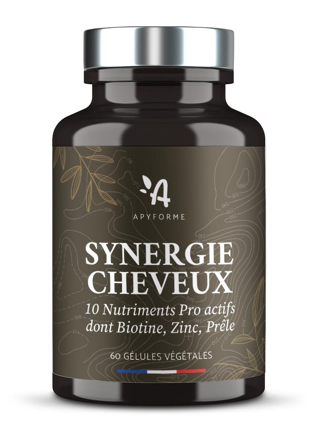 Pour vous aider à retrouver des cheveux en bonne santé, nous avons mis au point la formule Synergie Cheveux (ex-Biotine Végétale Bio Complexe), une synergie unique de vitamine B8 et de vitamines du groupe B issues d’extraits naturels de plantes, d’algues et de levure.